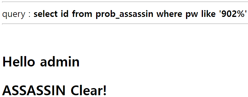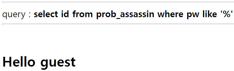 - Hello admin이 뜨지 않고 Hello guest가 떴다면, 이는 admin 계정과 guest 계정의 pw 첫번째 문자가 겹친다는 뜻이다. 둘의 문자가 같을 시 테이블 상 첫번째 레코드인 guest 계정이 fetch 되기 때문이다.