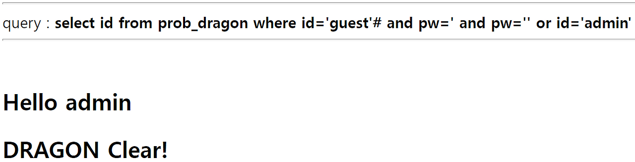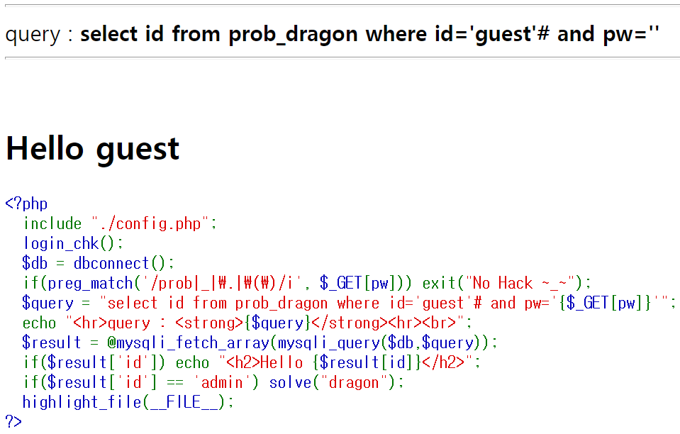 $query = "select id from prob_dragon where id='guest'# and pw='